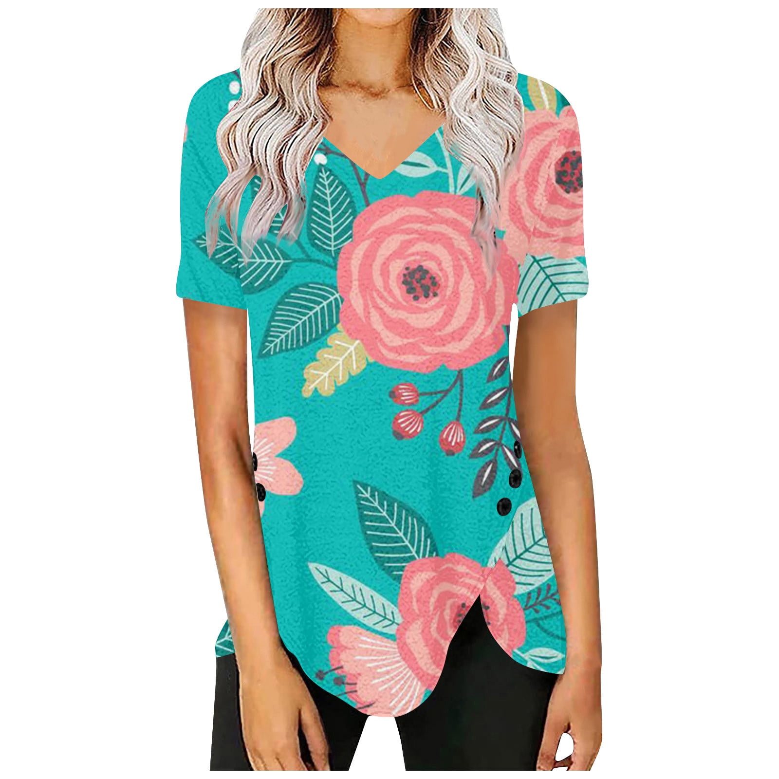 Dndkilg Going Out T Shirt For Women Short Sleeve Side Split Plus Size Button V Neck Floral Tshirt Cyan 2xl Walmart Com